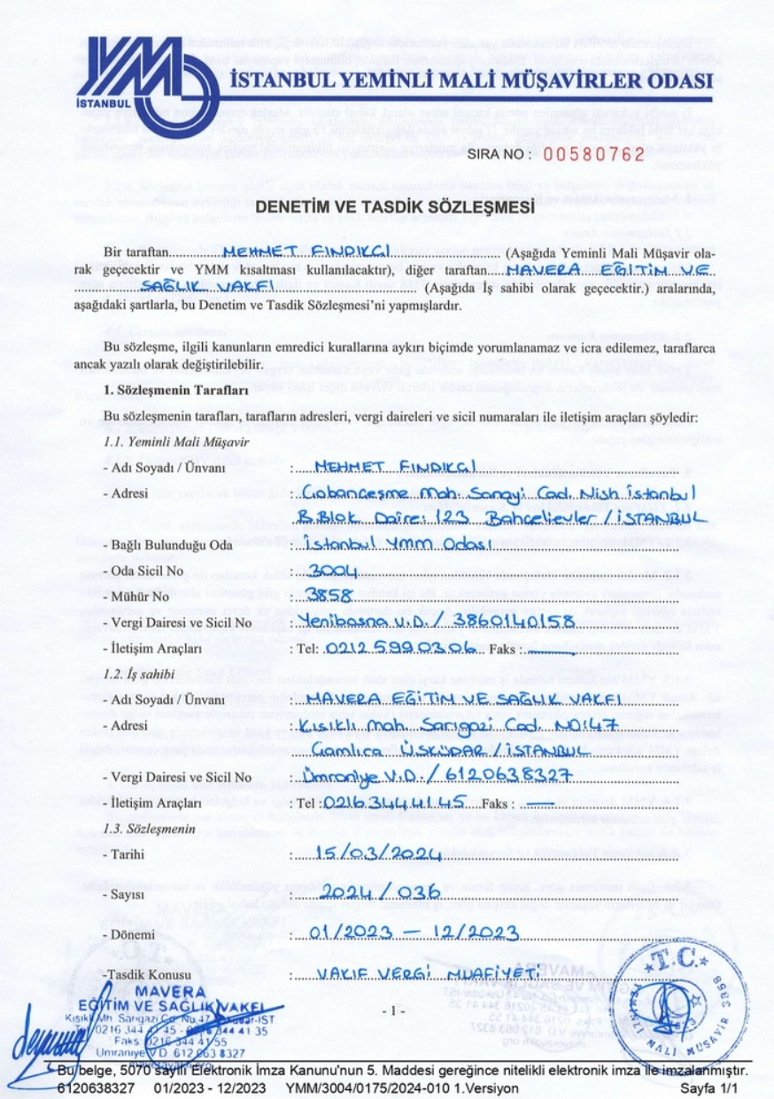 Müracaatımıza binaen, 4962 sayılı Kanunun 20’nci maddesine göre, Türkiye Cumhuriyeti Cumhurbaşkanlığı’nca 3 Nisan 2023 tarih ve 7027 sayılı kararı ile vakfımız, Vergi Muafiyeti Statüsü kazanmıştır.
